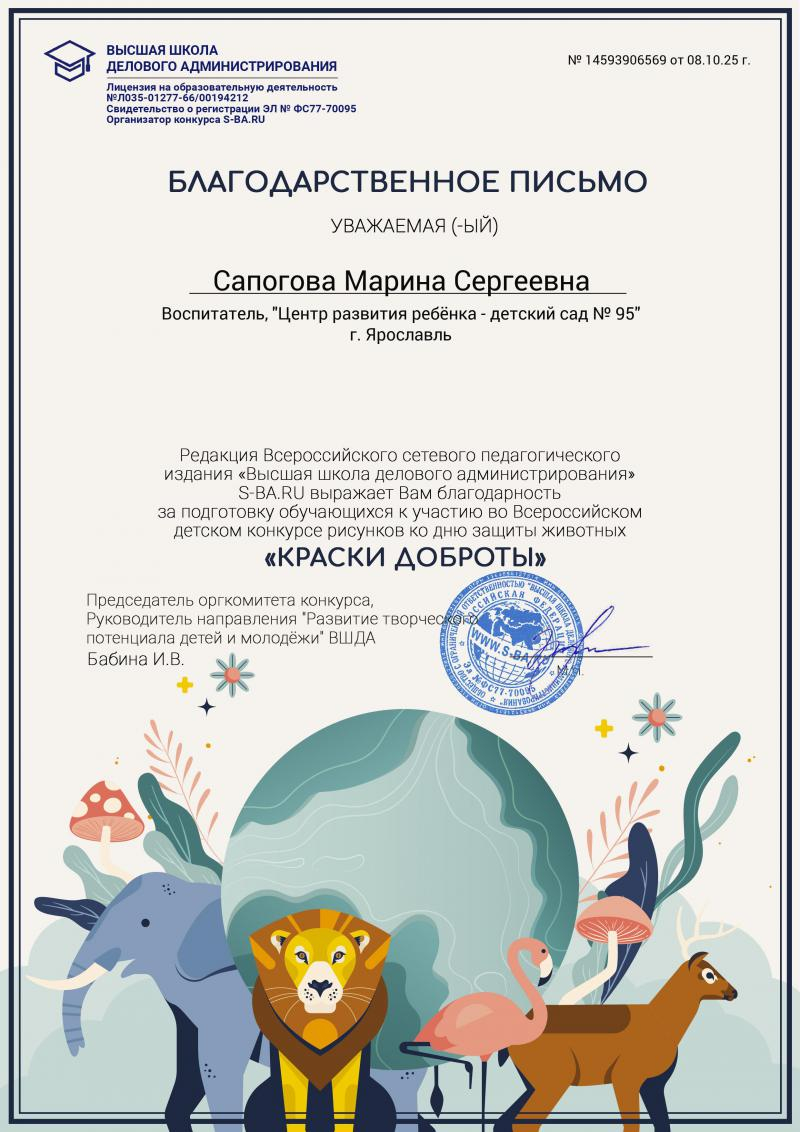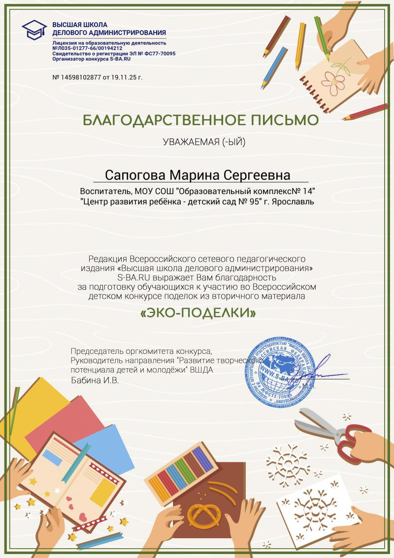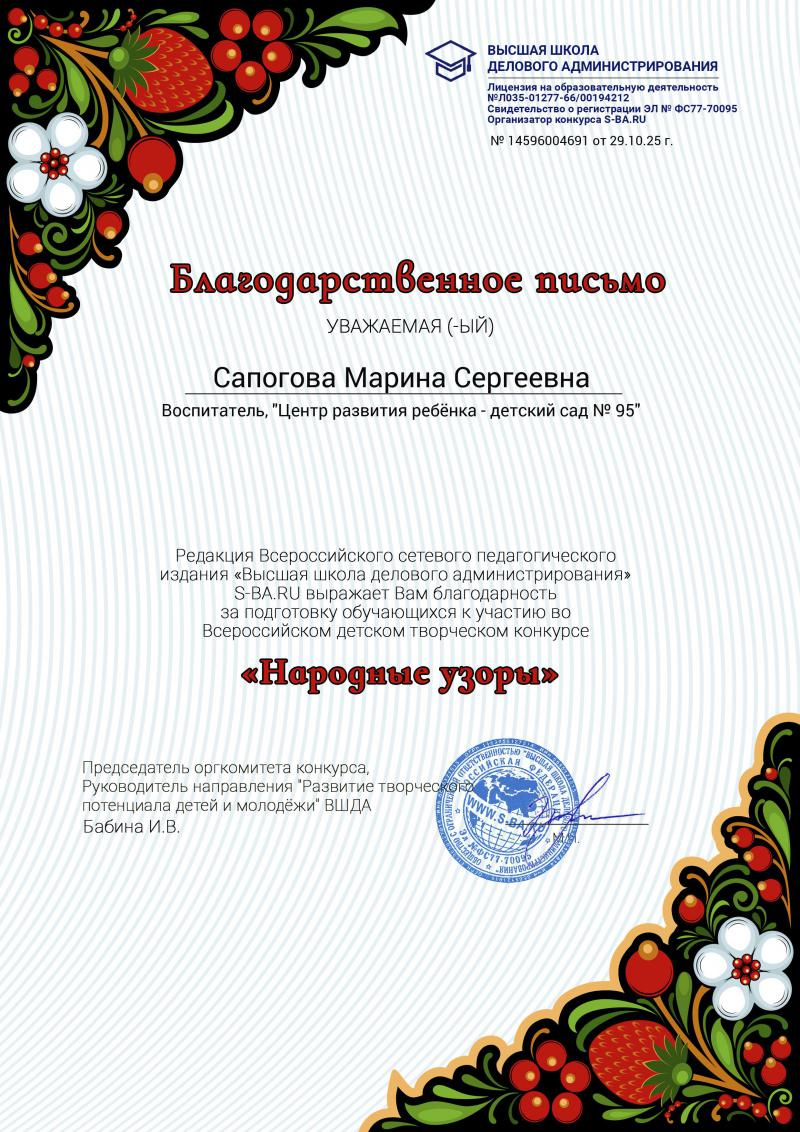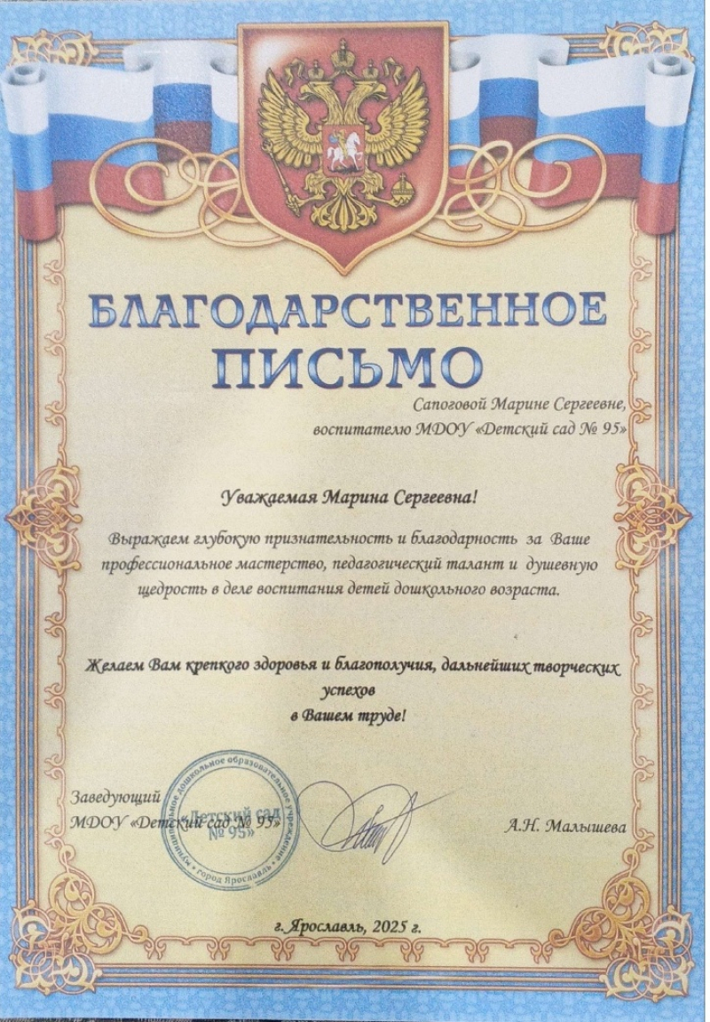 Сапогова Марина Сергеевна, воспитатель МДОУ "Детский сад № 95" г.Ярославль