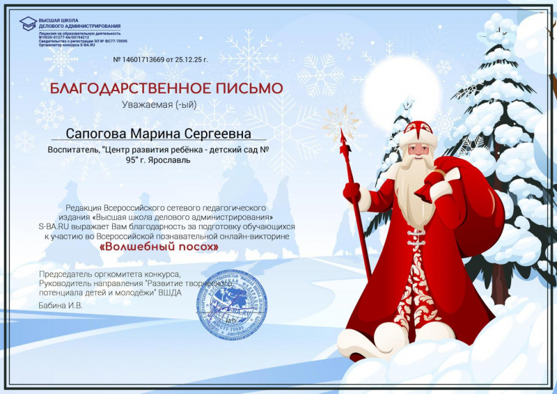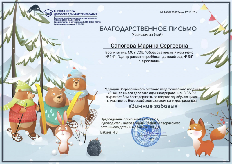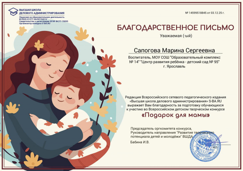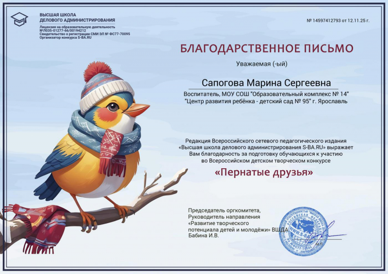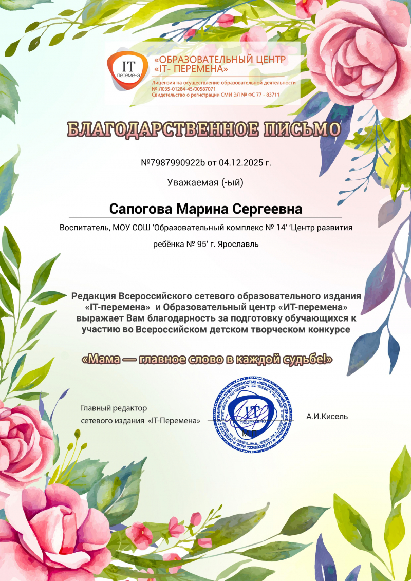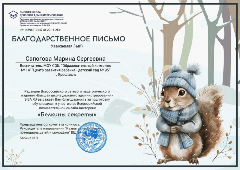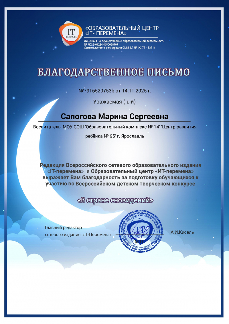 Сапогова Марина Сергеевна, воспитатель МДОУ "Детский сад № 95" г.Ярославль